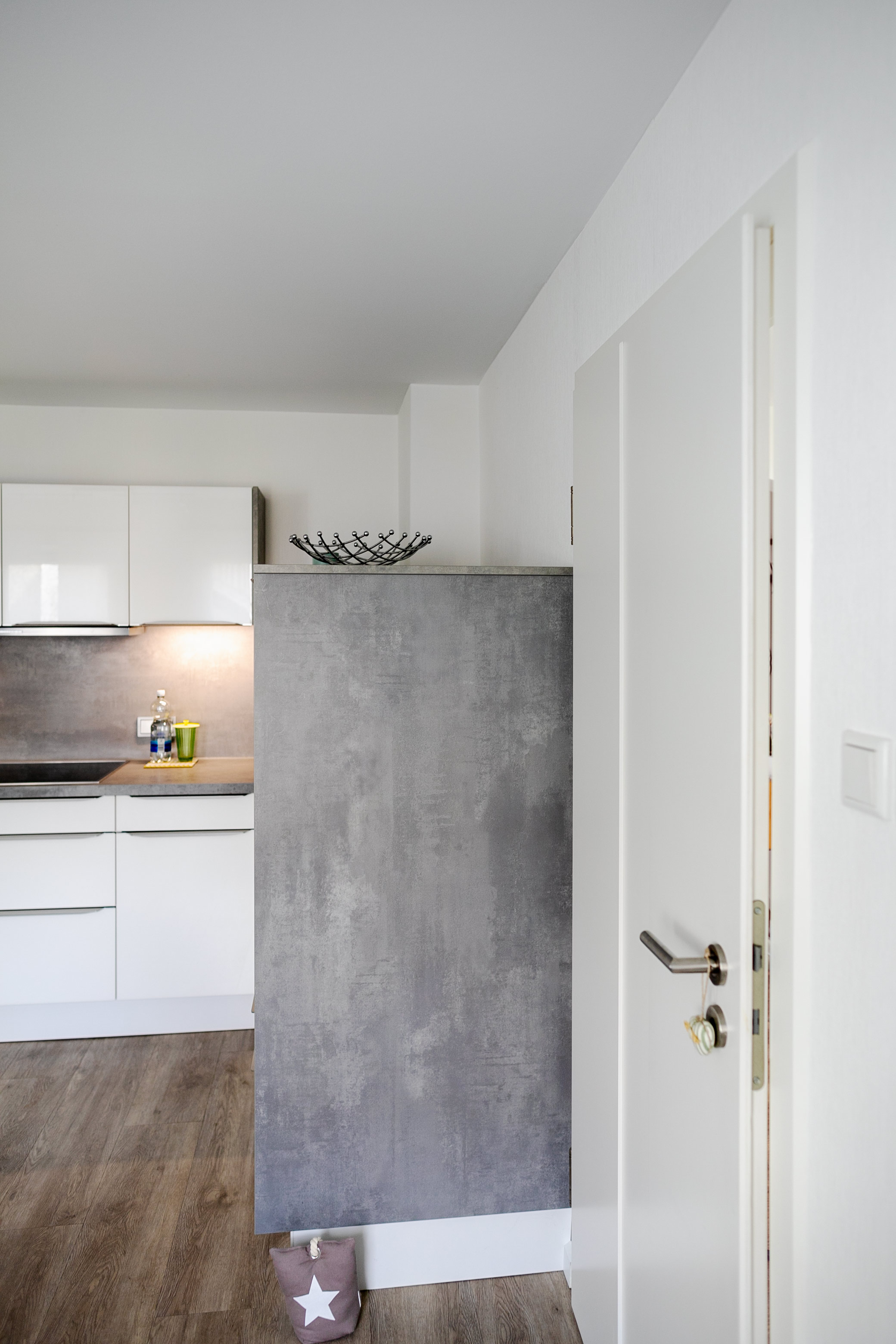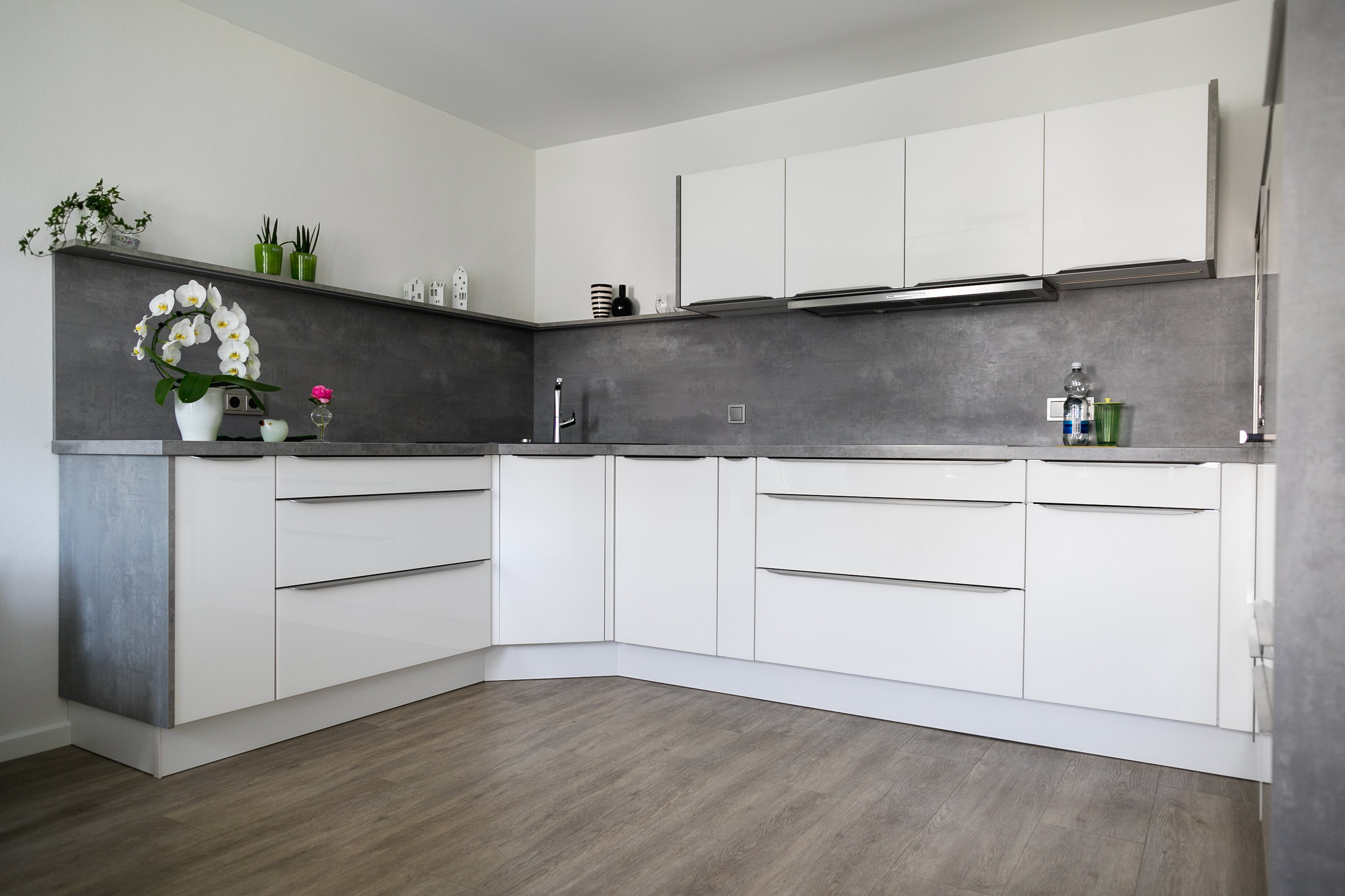 Details: Nischenrückwand im Beton-Dekor mit LED-Beleuchtung, Eckschrankbeschlag Magic-Basket, Handtuchhalter, Flachschirm.Dunsthaube, Rollo-Aufsatzschrank, übertiefe Hoschschränke, farblich passende Tischgruppe