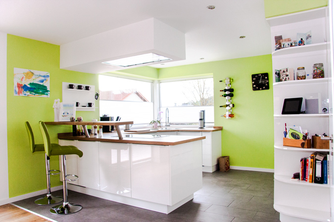 Moderne Hochglanz-Küche mit integrierter Holztheke