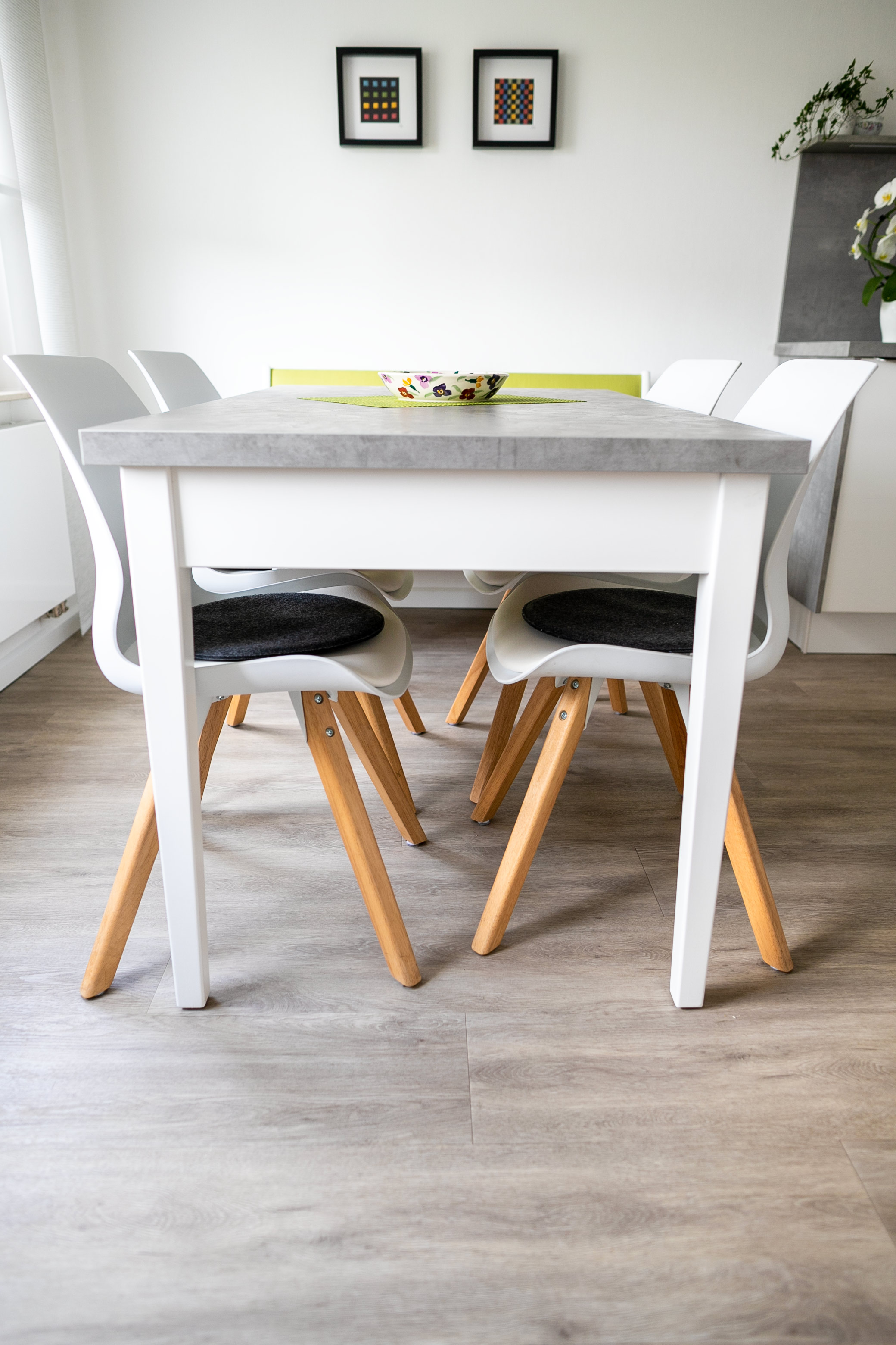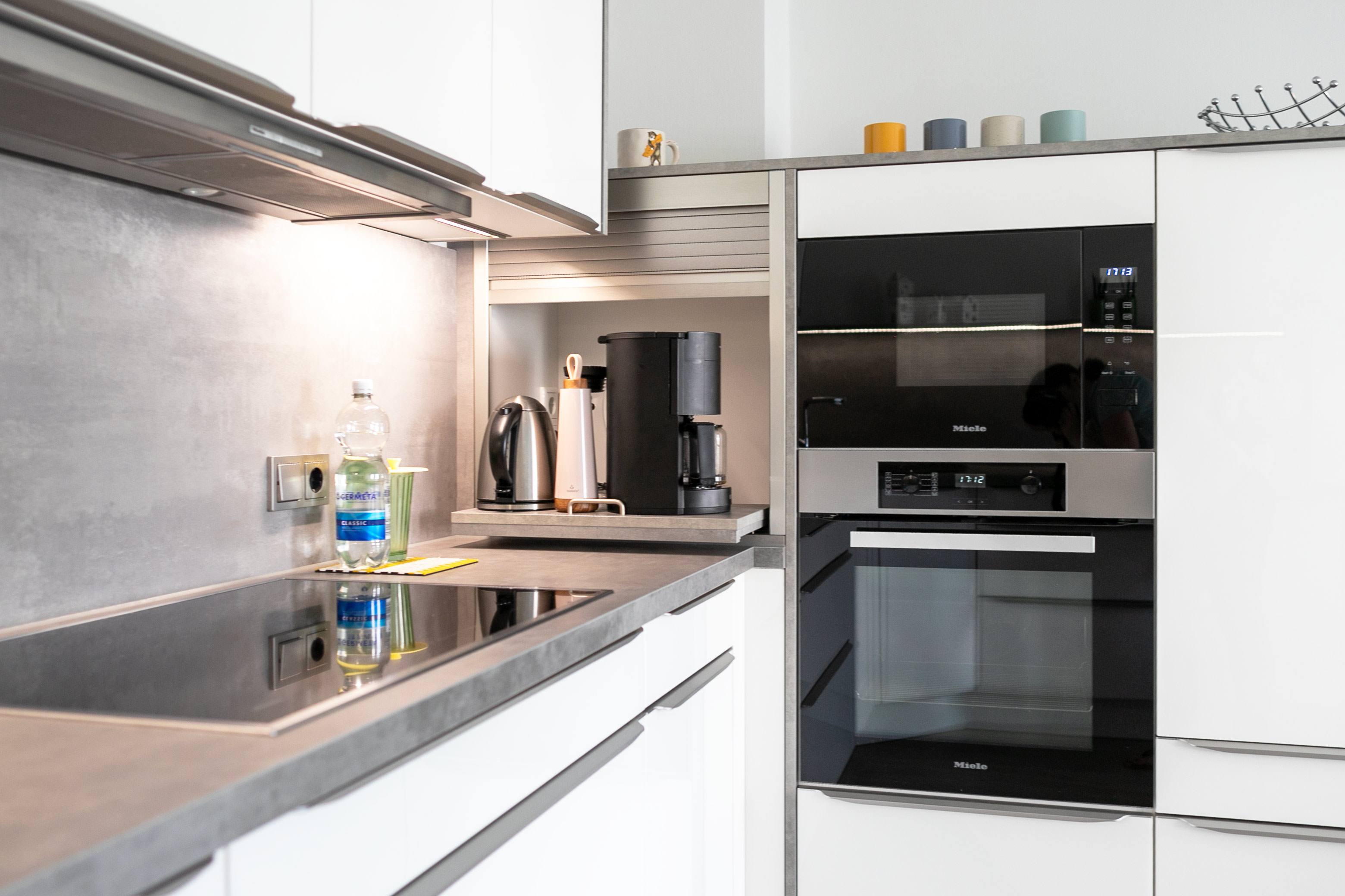 Details: Nischenrückwand im Beton-Dekor mit LED-Beleuchtung, Eckschrankbeschlag Magic-Basket, Handtuchhalter, Flachschirm.Dunsthaube, Rollo-Aufsatzschrank, übertiefe Hoschschränke, farblich passende Tischgruppe
